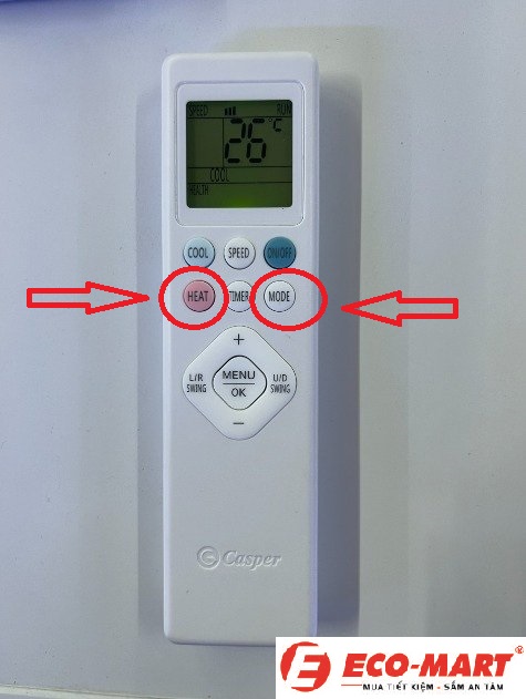Để mở khóa điều khiển điều hòa Casper các bạn sẽ nhấn và giữ trong 5 giây đồng thời tổ hợp 2 phím: Heat + Mode. Giống như hình ảnh dưới đây.