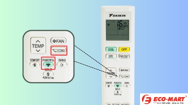 Muốn mở khóa điều khiển của điều hòa Daikin, các bạn nhấn và giữ đồng thời tổ hợp 2 phím: Econo + Powerfull cùng 1 lúc, khi nào trên màn hình mất đi hình ổ khóa là được. Giống như hình ảnh dưới đây.