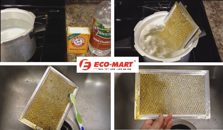 Vệ sinh lưới lọc bằng hỗn hợp baking soda và giấm ăn.
