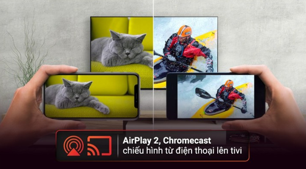 Chia Sẻ Hình Ảnh Thông Minh: Sản phẩm không chỉ làm chủ với tính năng chia sẻ hình ảnh thông minh, mà còn hỗ trợ cả iPhone và điện thoại Android thông qua tính năng Chromecast và AirPlay 2. Người dùng có thể dễ dàng chia sẻ nội dung video và hình ảnh từ điện thoại lên màn hình tivi một cách thuận tiện.