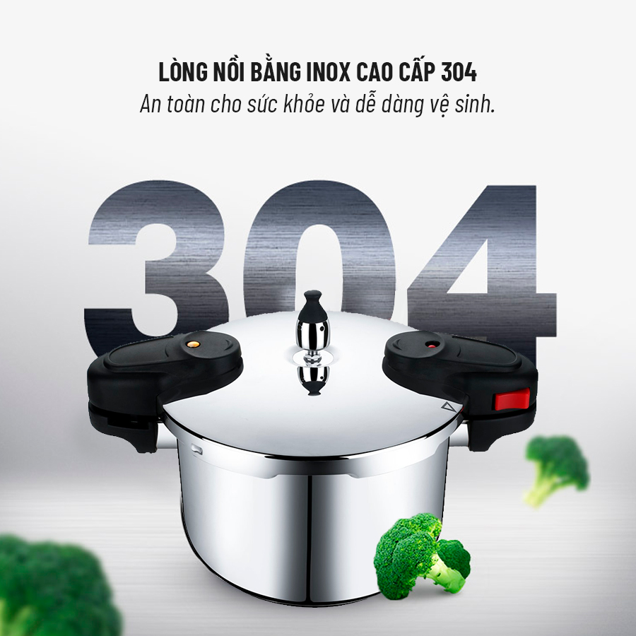 - Vung nồi bằng inox. Van điều chỉnh áp suất thiết kế thông minh với dải áp suất rộng, có thể điều chỉnh mức áp suất phù hợp cho mỗi món ăn.