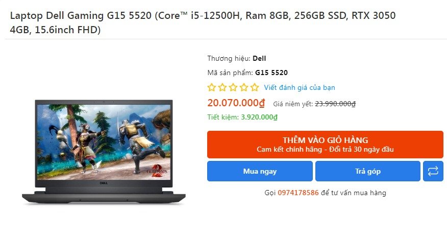 3. Laptop Dell Gaming G15 5520 (Core™ i5-12500H, Ram 8GB, 256GB SSD, RTX 3050 4GB, 15.6inch FHD)