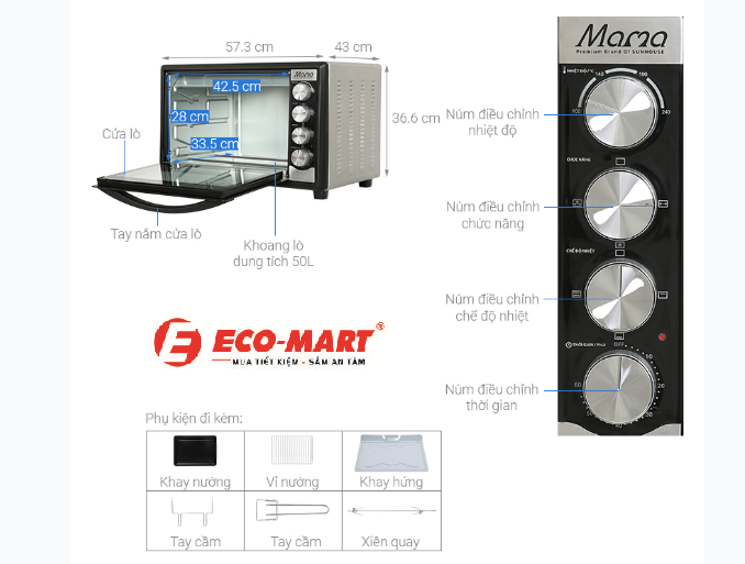 Lò nướng Sunhouse SHD4250S 50 lít là một sản phẩm khá phổ biến với thiết kế tiện lợi và dung tích lớn, phù hợp cho gia đình đông người hoặc khi có nhu cầu nướng nhiều món ăn cùng lúc. Đặc biệt với dung tích lớn 50 lít có thể nướng cả con gà tới 2 kg. Dưới đây là đánh giá chi tiết về sản phẩm này, hãy cùng Eco-mart tìm hiểu nhé.