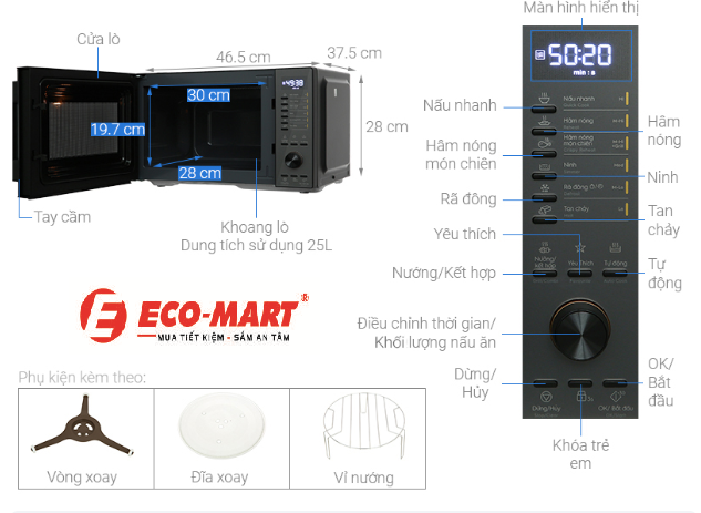 Công suất vi sóng và nướng mạnh mẽ: Khả năng nấu ăn nhanh chóng và chất lượng cao, chế biến được nhiều món ăn khác nhau từ rã đông đến nướng.