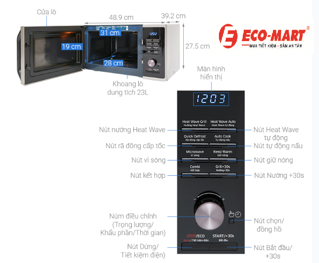 Dung tích 23 lít: Phù hợp cho gia đình từ 2-4 người, đáp ứng nhu cầu nấu nướng cơ bản như hâm nóng, rã đông và nướng các món nhỏ.