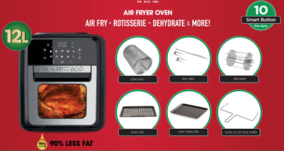 Magic Eco M-12 không chỉ nổi bật với khả năng nấu ăn nhanh và lành mạnh mà còn được trang bị nhiều phụ kiện đi kèm như khay chiên, vỉ nướng, xiên quay. Điều này giúp bạn có thể đa dạng hóa thực đơn gia đình với các món ăn phong phú, từ chiên, nướng đến quay thực phẩm.