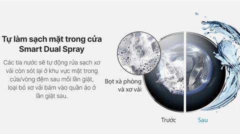 - Smart Dual Spray tự làm sạch mặt trong và vòng đệm cửa.