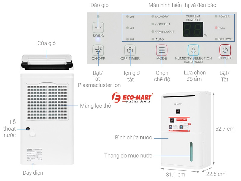 Máy hút ẩm Sharp DW-D12A-W là một thiết bị kết hợp giữa máy hút ẩm và máy lọc không khí, rất thích hợp cho các không gian sống có độ ẩm cao như phòng khách, phòng ngủ hoặc văn phòng. Dưới đây là đánh giá chi tiết về máy hút ẩm này, giúp bạn hiểu rõ hơn về những tính năng nổi bật và liệu đây có phải là lựa chọn tốt cho không gian của bạn. Hãy cùng Eco-mart tìm hiểu chi tiết nhé.