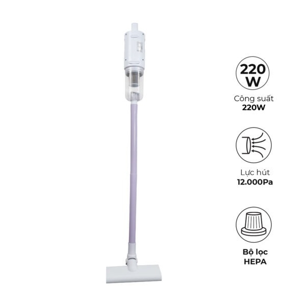 Công suất 220W – Lực hút 12.000Pa: Hút sạch bụi bẩn, tóc, lông thú cưng và rác nhỏ.
