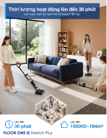 Thời lượng hoạt động máy lau nhà Floor One i5 Stretch Plus lâu dài lên đến 30 phút