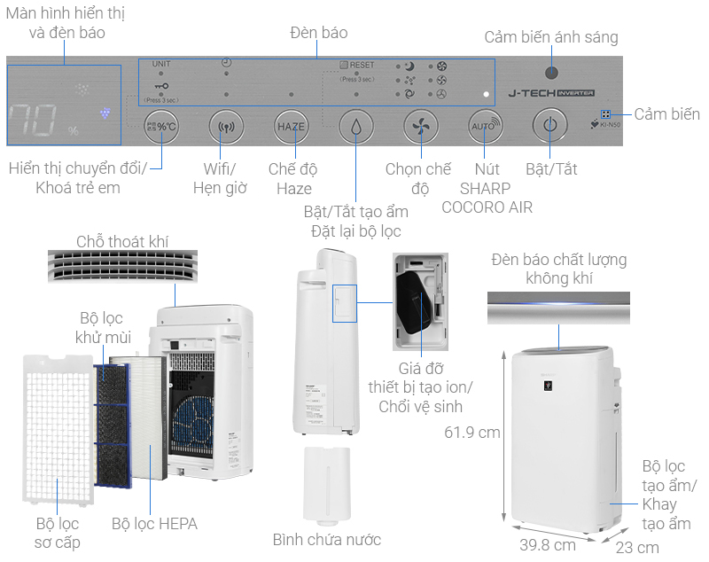 - Sharp KI-N50V-W 51W sở hữu thiết kế mới, mỏng hơn, màu trắng trang nhã phù hợp với nhiều không gian. Sản phẩm có trang bị bình chứa nước dung tích 2.7 lít cho chức năng tạo ẩm.