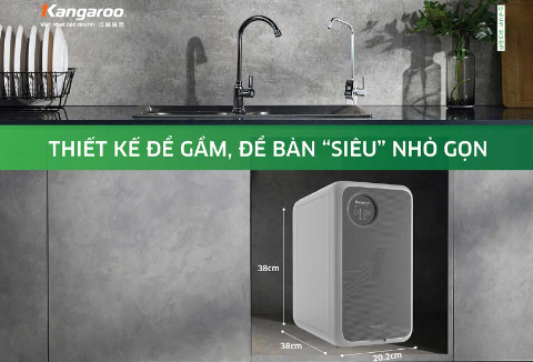 Máy lọc nước Kangaroo KG100US có kiểu dáng để bàn hoặc đặt gầm tủ với kích thước "siêu" nhỏ gọn, chiều ngang chỉ 20cm, chiều sâu và cao 38cm. Thiết kế liền khối của máy không chỉ giúp hạn chế bụi bẩn mà còn đảm bảo dễ dàng thay thế các lõi lọc với chỉ 3 bước đơn giản. Mặt trước của máy được trang trí họa tiết lấy cảm hứng từ chữ “K” trong logo Kangaroo, tượng trưng cho vị trí dẫn đầu thị trường của thương hiệu này tại Việt Nam.