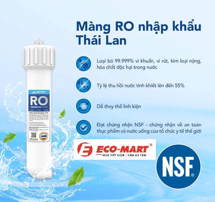 + Màng lọc RO 75 GPD Hitech: Nhập khẩu từ Thái Lan, đạt tiêu chuẩn quốc tế NSF, loại bỏ 99.99% vi khuẩn, vi rút, kim loại nặng và hóa chất độc hại.