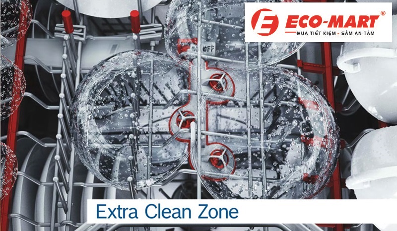 Extra Clean Zone đảm bảo sự sạch sẽ tối đa cho các bát đĩa ở khu vực trên giỏ, loại bỏ 99,99% các vi khuẩn, đặc biệt là trên các bề mặt phức tạp và nhạy cảm như thủy tinh.