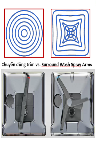 Cánh tay phun được lập trình theo chuyển động hình chữ nhật trong khi hầu hết là chuyển động tròn, vì vậy bát đĩa ở các góc không thể tiếp nhận đủ lượng nước và chất tẩy rửa.
