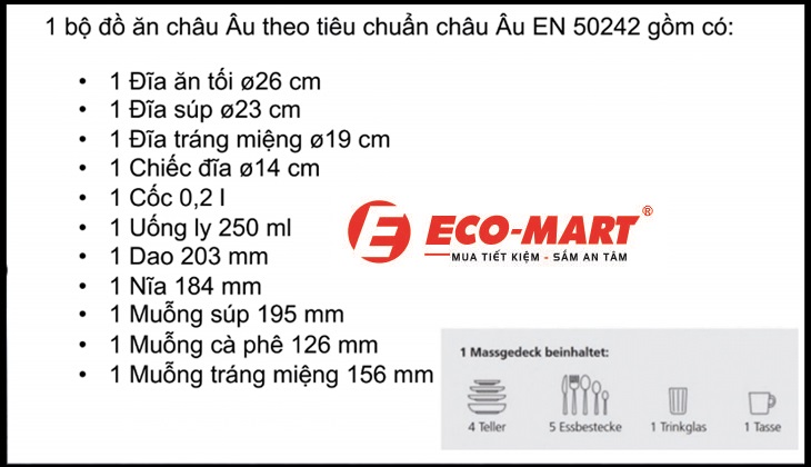 1. Tiêu chuẩn 1 bộ đồ ăn Châu Âu.