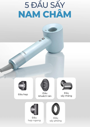 - 5 đầu sấy hít nam châm: Máy đi kèm 5 phụ kiện đầu sấy với cơ chế hít nam châm, giúp thay đổi dễ dàng và an toàn trong quá trình sử dụng. Các đầu sấy bao gồm: