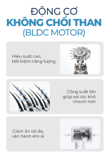 - Động cơ không chổi than (BLDC): Vận hành êm ái, tuổi thọ cao và hiệu suất ổn định.