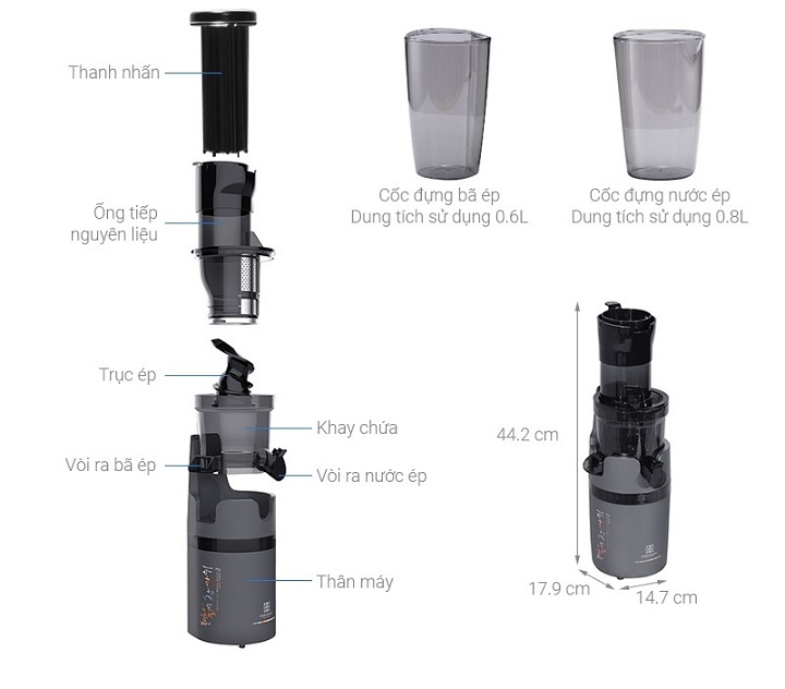 - Cốc chứa nước ép và cốc chứa bã: Thiết kế riêng biệt, dễ dàng phân tách nước ép và bã.