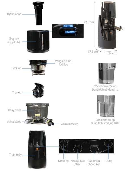 - Cốc đựng nước ép và cốc chứa bã: Hai cốc dung tích lớn, tiện lợi cho việc chế biến.