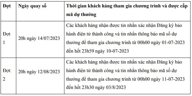 Bằng chứng xác định trúng thưởng là mã số dự thưởng sẽ được cung cấp cho khách hàng ngay sau khi khách hàng tiến hành kích hoạt bảo hành thành công. Thời hạn phát hành bằng chứng xác định trúng thưởng là từ 00h00 ngày 01/07/2023 đến 23h30 ngày 03/08/2023.