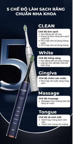 - Chế độ trắng sáng (White): Dao động nhịp nhàng giúp loại bỏ các vết ố trên bề mặt răng, mang lại nụ cười rạng rỡ hơn.