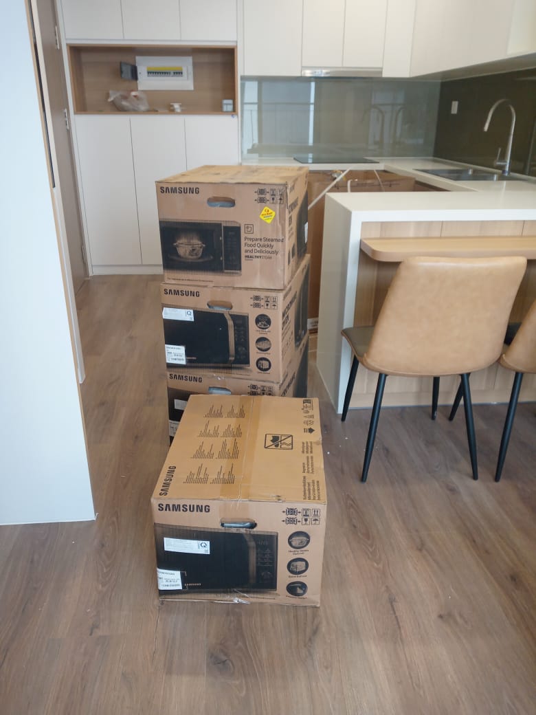 Chị Thủy tại Tòa I1 Smart City Imperia đã đặt mua ngay 4 chiếc lò vi sóng Samsung MS23K3513AS. Chiếc lò vi sóng này có dung tích 23 lít, công suất 800W, cùng 6 mức điều chỉnh công suất và chế độ rã đông nhanh. Đơn hàng đã nhanh chóng được chuyển đến tận căn hộ của chị. Chị Thủy rất tin tưởng và hài lòng với dịch vụ của ECO-MART, điều này khiến ECO-MART vô cùng tự hào và tiếp tục nỗ lực mang đến hàng chính hãng với giá tốt nhất cho khách hàng.