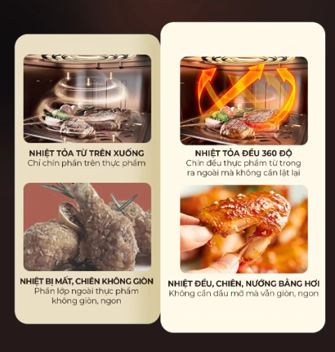 - Luồng khí nóng được thổi tuần hoàn 360°, giúp thực phẩm chín đều mà không cần lật.