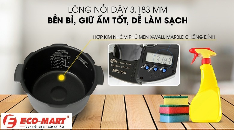 Lòng nồi được làm từ chất liệu hợp kim hấp thu nhiệt nhanh, tỏa nhiệt đều, giúp cơm chín đều và ngon hơn. Bề mặt lòng nồi được phủ lớp chống dính cao cấp, ngăn ngừa tình trạng cơm cháy, và đồng thời dễ dàng vệ sinh sau khi sử dụng.