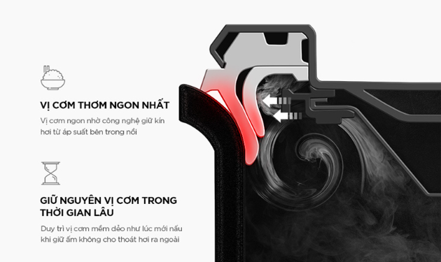 Trang bị van áp suất Double Soft Steam Cap trên nồi cơm điện đảm bảo giữ áp suất trong nồi ổn định trong suốt quá trình nấu. Khi khóa van áp suất, môi trường trong nồi gần như môi trường chân không, giúp bảo quản cơm, thức ăn thời gian lâu hỏng hơn so với nhiều chiếc nồi cơm điện khác trên thị trường hiện nay.