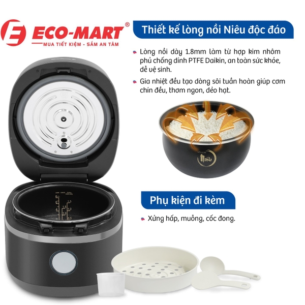 + Nồi cơm điện tử cao tần Bluestone sử hữu lòng nồi niêu siêu dày 1.8mm phủ chống dính PTFE Daikin cao cấp không sản sinh độc tố, an toàn với sức khỏe