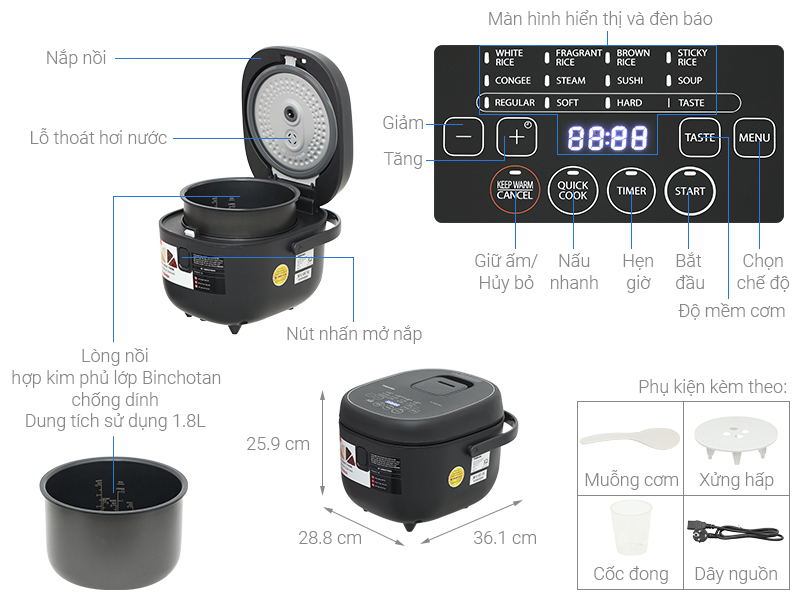 Chế độ nấu đa dạng: Nồi được trang bị 10 chương trình nấu cài đặt sẵn, bao gồm: cơm trắng, gạo thơm, cơm gạo lứt, xôi, cháo, hấp, cơm sushi, súp, nấu nhanh và giữ ấm. Ngoài ra, có 3 chế độ nấu cơm tùy theo sở thích.