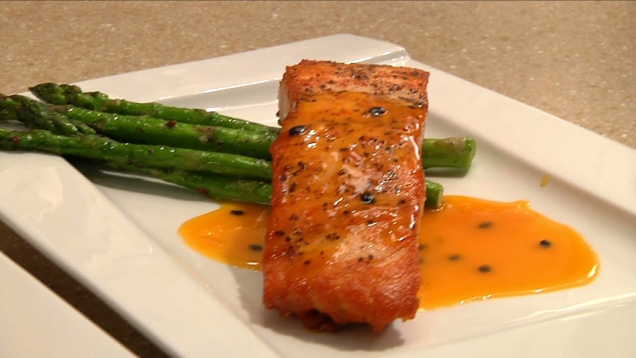Trong lúc chờ cá chín, bạn hãy chuẩn bị phần sốt chanh leo để lát ăn kèm với cá hồi nướng.