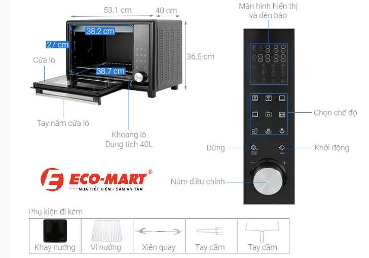 Dung tích thiết kế 40 lít: Với dung tích lớn, lò nướng có thể dễ dàng chế biến nhiều loại món ăn cùng một lúc, đặc biệt phù hợp cho gia đình từ 4-6 người hoặc những buổi tiệc nhỏ. Bạn có thể nướng gà nguyên con, bánh lớn hoặc nhiều khay bánh quy cùng lúc, giúp tiết kiệm thời gian và công sức.