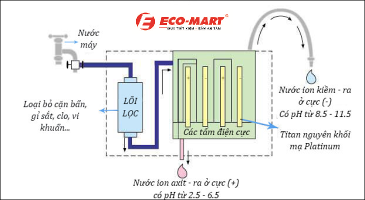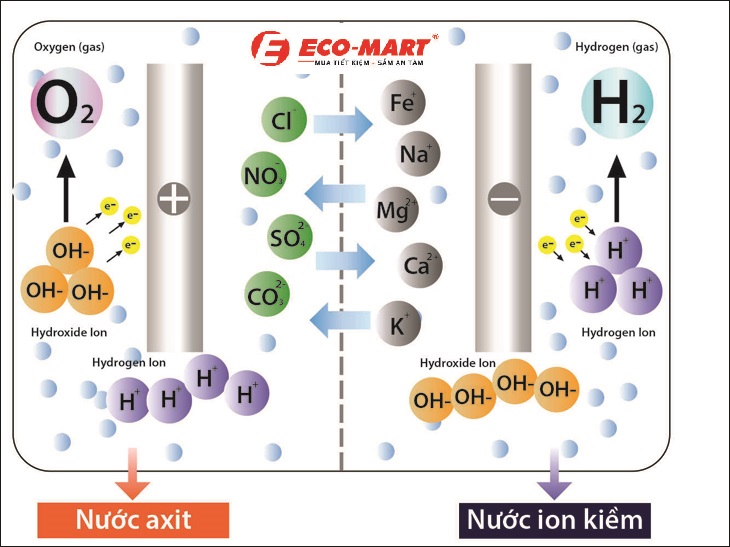 Điện phân nước: Khi nước chảy qua các tấm điện cực titan, dòng điện sẽ tạo ra quá trình điện phân, phân tách nước thành các ion H+ (nước axit) và OH- (nước kiềm). Nước ion kiềm được cho là có nhiều lợi ích cho sức khỏe, như giúp cân bằng pH cơ thể và hỗ trợ hệ tiêu hóa.