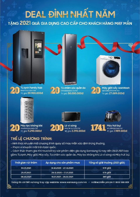 Khi mua bất kỳ sản phẩm gia dụng Samsung được khuyến mãi từ 14/12/2020 đến 28/02/2021, bạn sẽ được sử dụng số serial của sản phẩm để tham gia chương trình Quay số trúng thưởng với hàng ngàn quà tặng hấp dẫn!