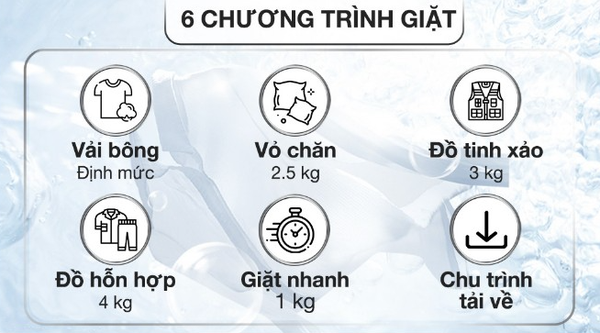 - Trang bị 6 chương trình giặt cài đặt sẵn bao gồm: vải bông, vỏ chăn, đồ tinh xảo, đồ hỗn hợp, sấy nhanh, chu trình tải về. Trong đó, có chương trình sấy nhanh giúp tiết kiệm thời gian giặt, đảm bảo khi bạn cần bộ đồ yêu thích đã sẵn sàng để bạn mặc lên người đi chơi, đi dự tiệc, du lịch,...