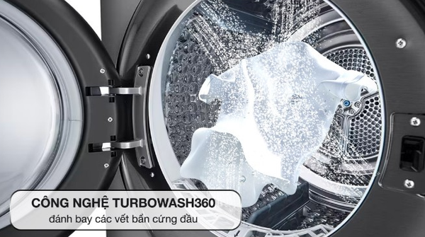 - TurboWash360 công nghệ có khả năng tạo áp lực nước lớn giúp làm tan chất giặt tẩy, nâng cao tốc độ thẩm thấu bột giặt vào sâu trong từng sợi vải, đánh bay các vết bẩn cứng đầu, giúp quá trình làm sạch quần áo nhanh chóng hơn.