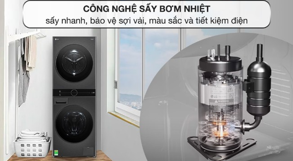 - Công nghệ sấy bơm nhiệt Dual Inverter Heat Pump™ với hai xi lanh cho thiết bị hoạt động mạnh mẽ sấy khô quần áo trong thời gian ngắn mà bảo toàn chất lượng, màu sắc vải đồng thời giúp làm giảm tiêu thụ điện năng của thiết bị tối ưu.