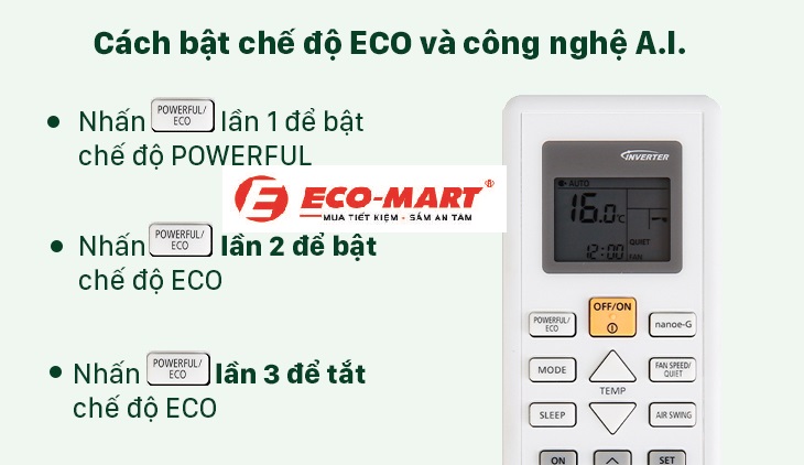 Nhấn phím POWERFUL/ECO lần 2 để bật chế độ ECO.