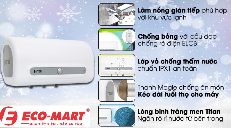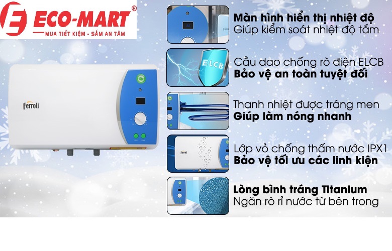 - Bình nóng lạnh Ferrolii an toàn nhờ hệ thống chống rò rỉ điện ELCB thiết bị sẽ tự động ngắt kết nối với nguồn điện khi bị rò rỉ điện, giúp bảo vệ an toàn cho người sử dụng