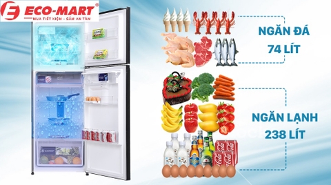 Tủ có dung tích sử dụng 312 lít, bao gồm ngăn đá 74 lít và ngăn lạnh 238 lít, đáp ứng nhu cầu lưu trữ thực phẩm đa dạng cho gia đình từ 3 đến 4 thành viên.