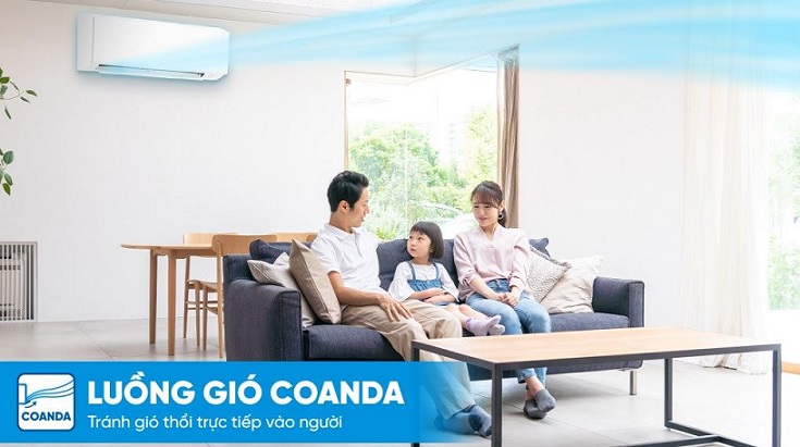 Thiết kế Coanda giúp luồng gió hướng lên trần nhà và lan tỏa đều khắp không gian, mang lại cảm giác mát lạnh tự nhiên, không gây buốt hay khô da. Tính năng này đặc biệt hữu ích khi sử dụng trong phòng ngủ hoặc không gian kín.