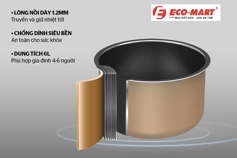 Lòng nồi được làm từ hợp kim nhôm siêu bền, phủ lớp chống dính cao cấp, giúp thức ăn không bị bám dính và dễ dàng vệ sinh. Chất liệu này cũng đảm bảo an toàn cho sức khỏe và giữ nhiệt tốt, giúp thức ăn chín đều và giữ trọn dinh dưỡng.