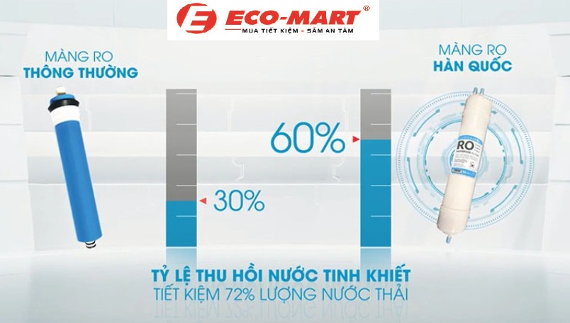 + Máy lọc nước sử dụng màng lọc RO 100 GPD nhập khẩu trực tiếp Hàn Quốc. Giúp tăng tỷ lệ nước tinh khiết lên 60% giảm nước thải còn 40%, cung cấp tới 20 lít nước trên giờ,
