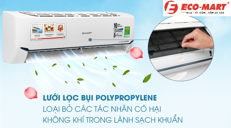 Mẫu Sharp 9000btu này có trang bị phin lọc bụi Polypropylene, có tác dụng khử mùi, kháng khuẩn, ngăn ngừa được vi khuẩn và nấm mốc trong không khí, lọc được cả nhưng mùi hôi như mùi thuốc lá, ngăn được các chất gây dị ứng cho da.