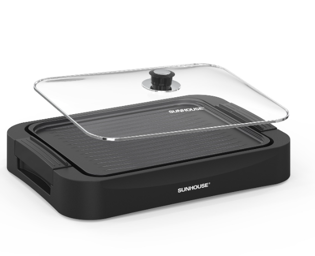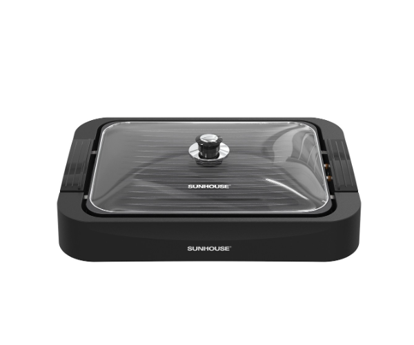 Sunhouse SHD4604 được thiết kế với mặt nướng rộng, có thể chế biến nhiều món cùng lúc, phù hợp cho gia đình đông người hoặc các buổi tiệc tại nhà. Lớp phủ chống dính PTFE giúp thực phẩm không bị cháy dính, đồng thời dễ vệ sinh sau khi sử dụng. Điểm nhấn lớn nhất chính là **nắp kính cường lực trong suốt**: vừa giúp giữ nhiệt, giữ ẩm cho món ăn, vừa hạn chế dầu mỡ bắn ra ngoài, giữ không gian nấu nướng luôn sạch sẽ. Ngoài ra, sản phẩm còn có khay hứng dầu mỡ bằng inox chống gỉ, dễ tháo rời để vệ sinh. Tay cầm và viền bếp được làm từ nhựa cách nhiệt, an toàn cho người dùng.